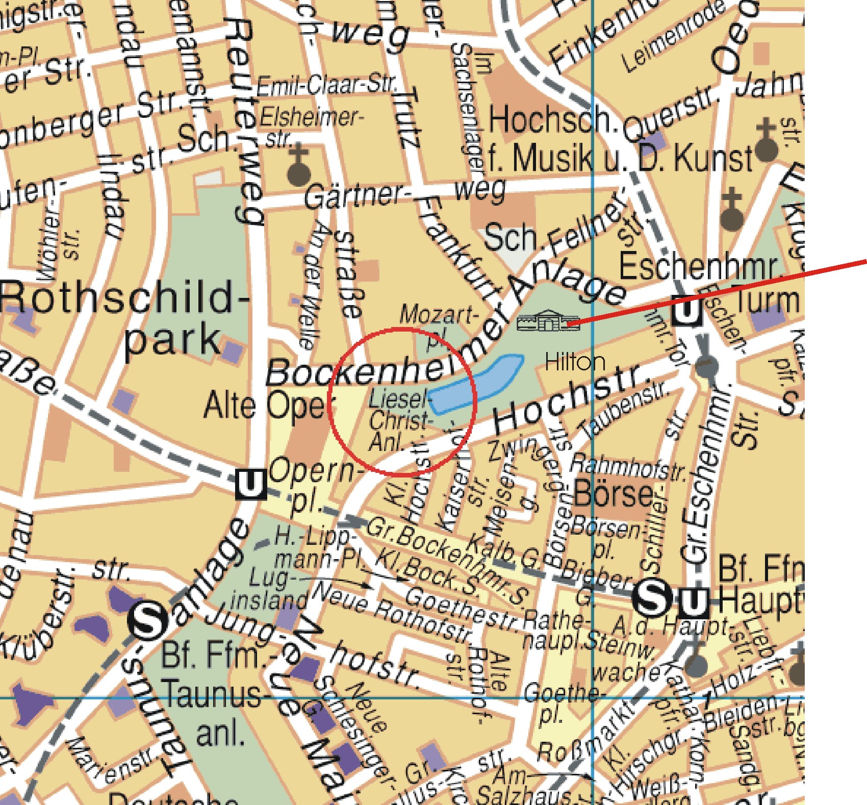 Parkmöglichkeit im Parkhaus ALTE OPER -nach dem Ausgang befindet sich an der Rückseite der Oper die “Liesel Christ Anlage” - am Teich vorbei befindet sich im Park die Galerie des Nebbienschen Gartenhauses. (ca. 5-8 Geh-Minuten vom Parkhaus entfernt, gegenüber dem Hilton-Hotel.)